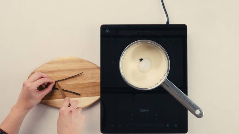 Schneide die Vanilleschote der Länge nach auf und kratze die Samen heraus. Gib die Samen und die Schote zusammen mit der Schlagsahne, dem Zucker und dem Salz in einen Topf und bringe die Mischung langsam zum Kochen. Wenn die Mischung kocht, schalte die Hitze aus und rühre weiter, bis sich der gesamte Zucker aufgelöst hat. Decke den Topf mit einem Deckel ab und lasse die Creme auf Raumtemperatur abkühlen.