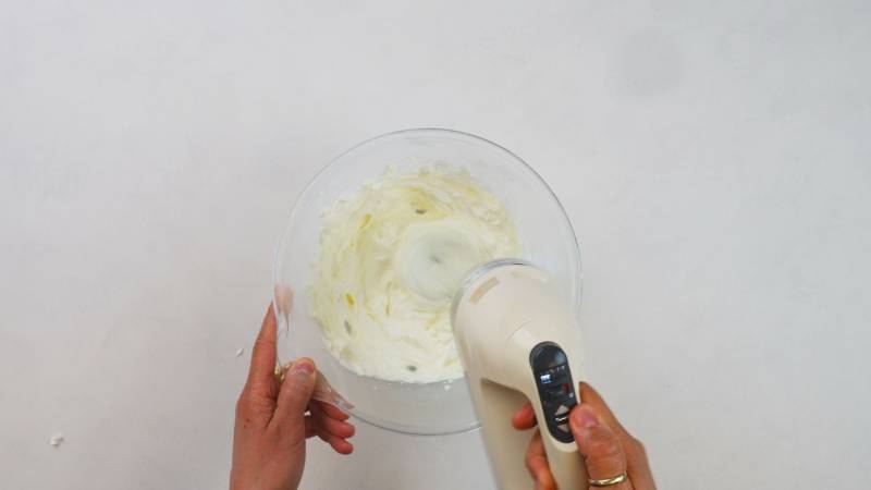 Mascarpone und Puderzucker 2 Minuten lang glatt und cremig rühren. Beiseitestellen.