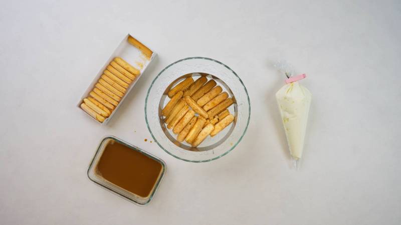 Fülle die Creme in einen Spritzbeutel. Tauche die Löffelbiskuits in den Latte. Beginne mit den eingetauchten Löffelbiskuits. Schließe mit einer Schicht Creme ab und bestreue das Tiramisu mit Kakaopulver.