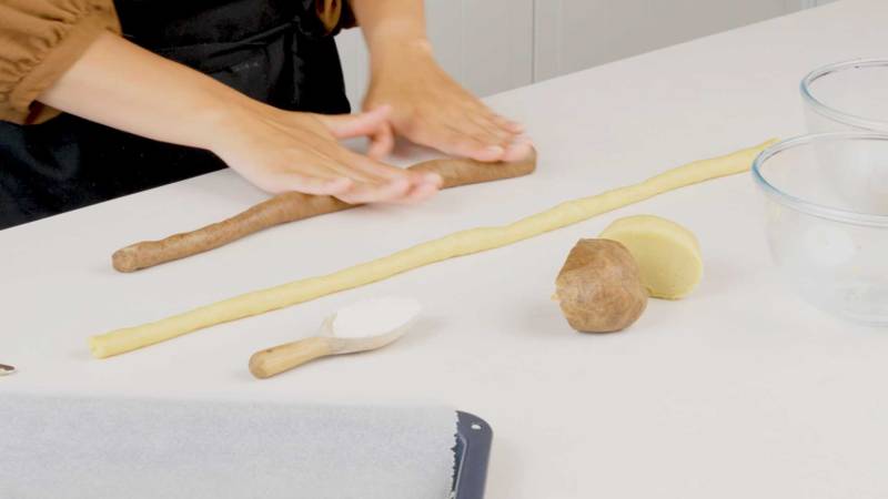 Divisez la pâte à la vanille en deux portions égales et roulez chaque portion en bâtonnet d'un diamètre de 1 cm. Répétez le même processus avec la pâte au cacao.
