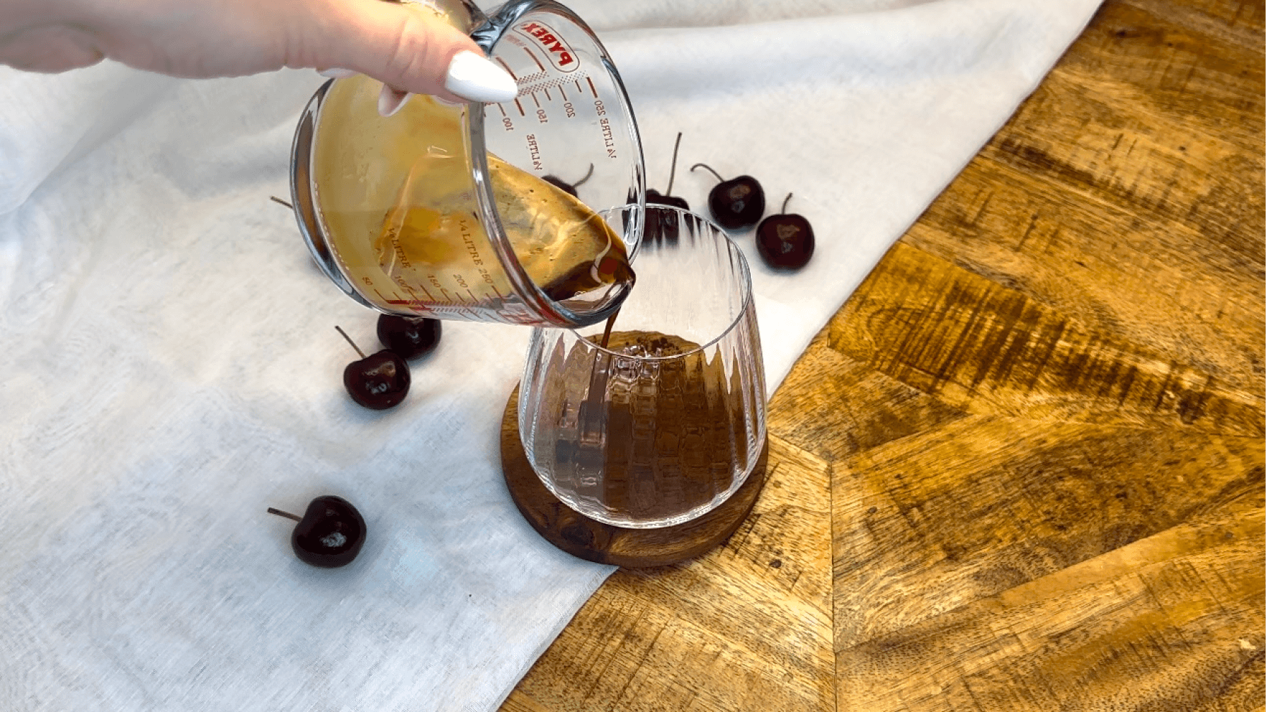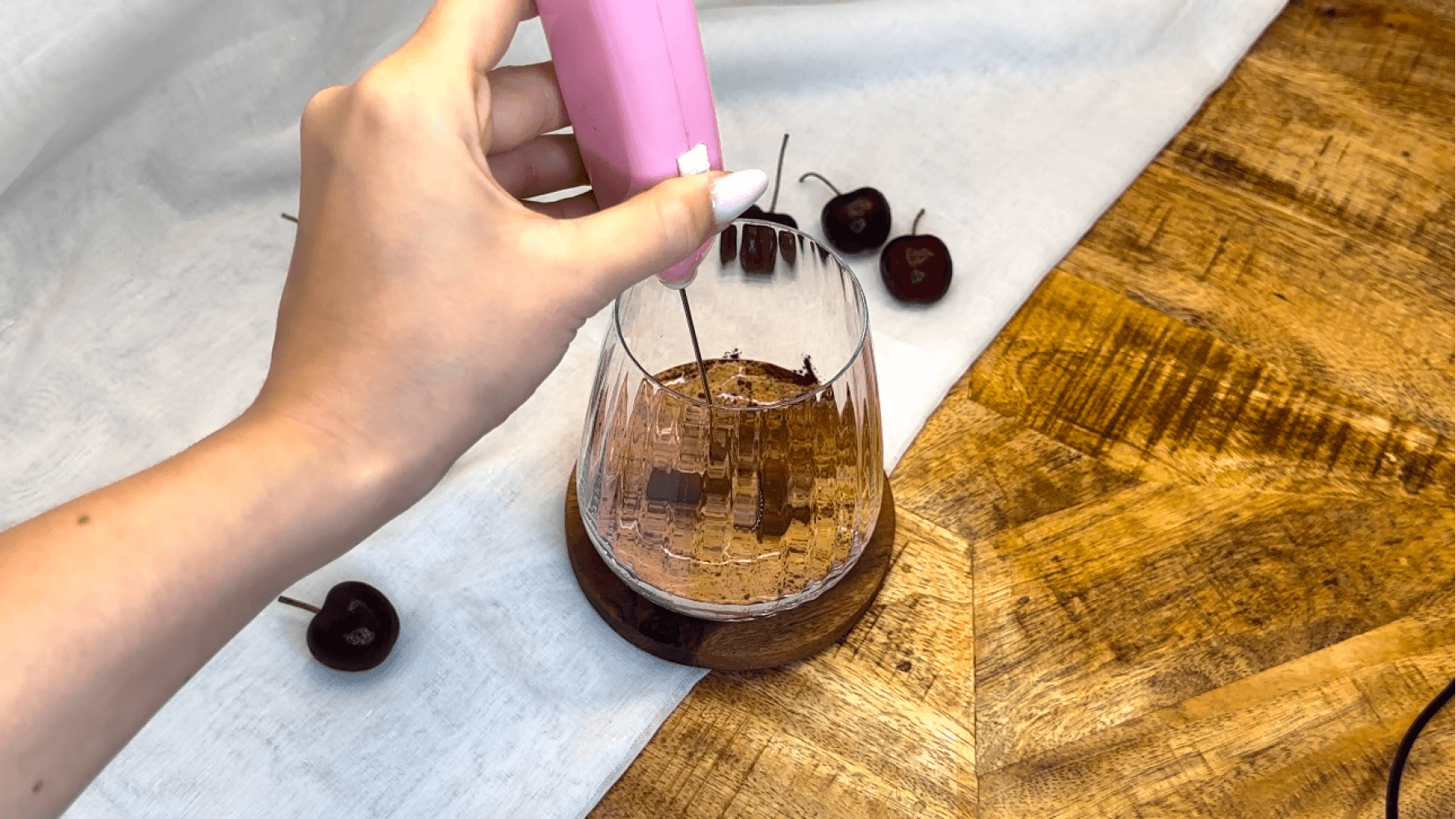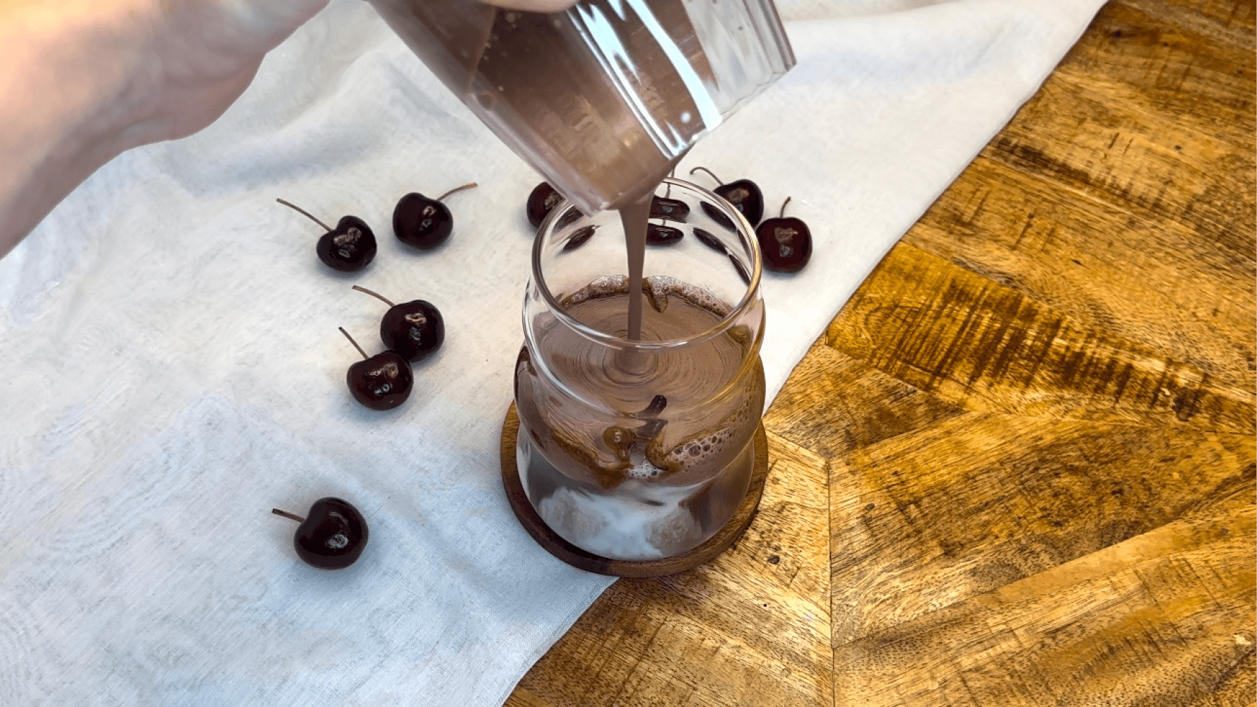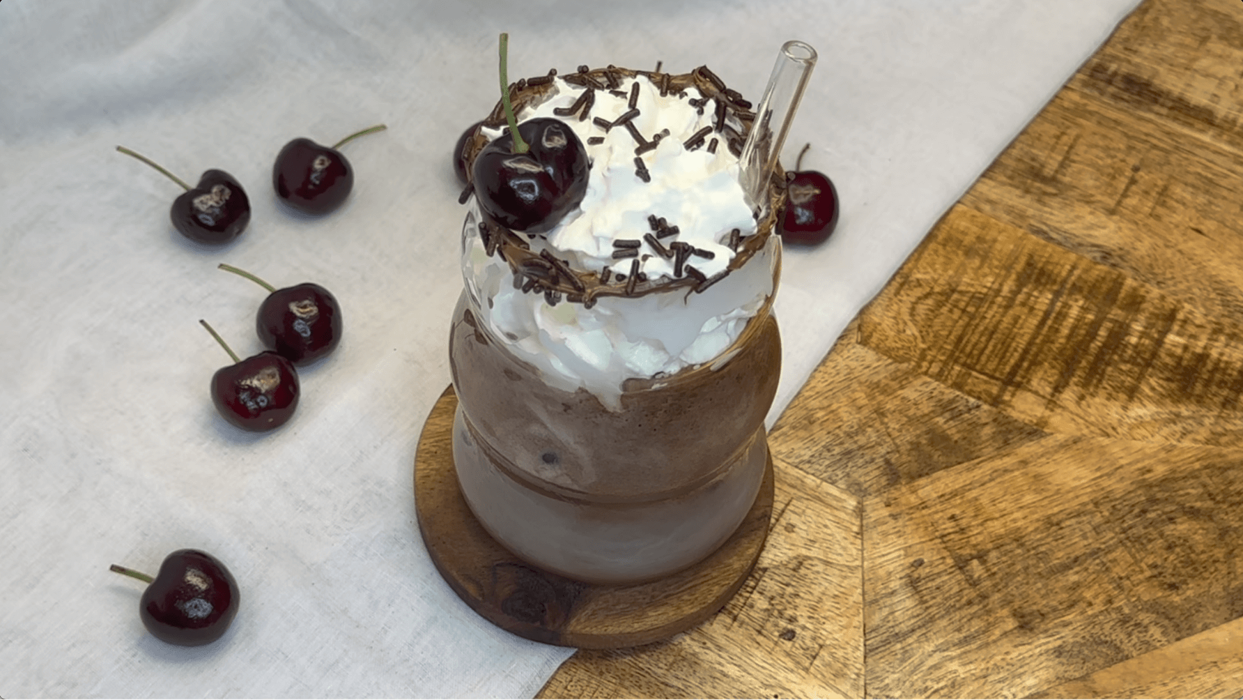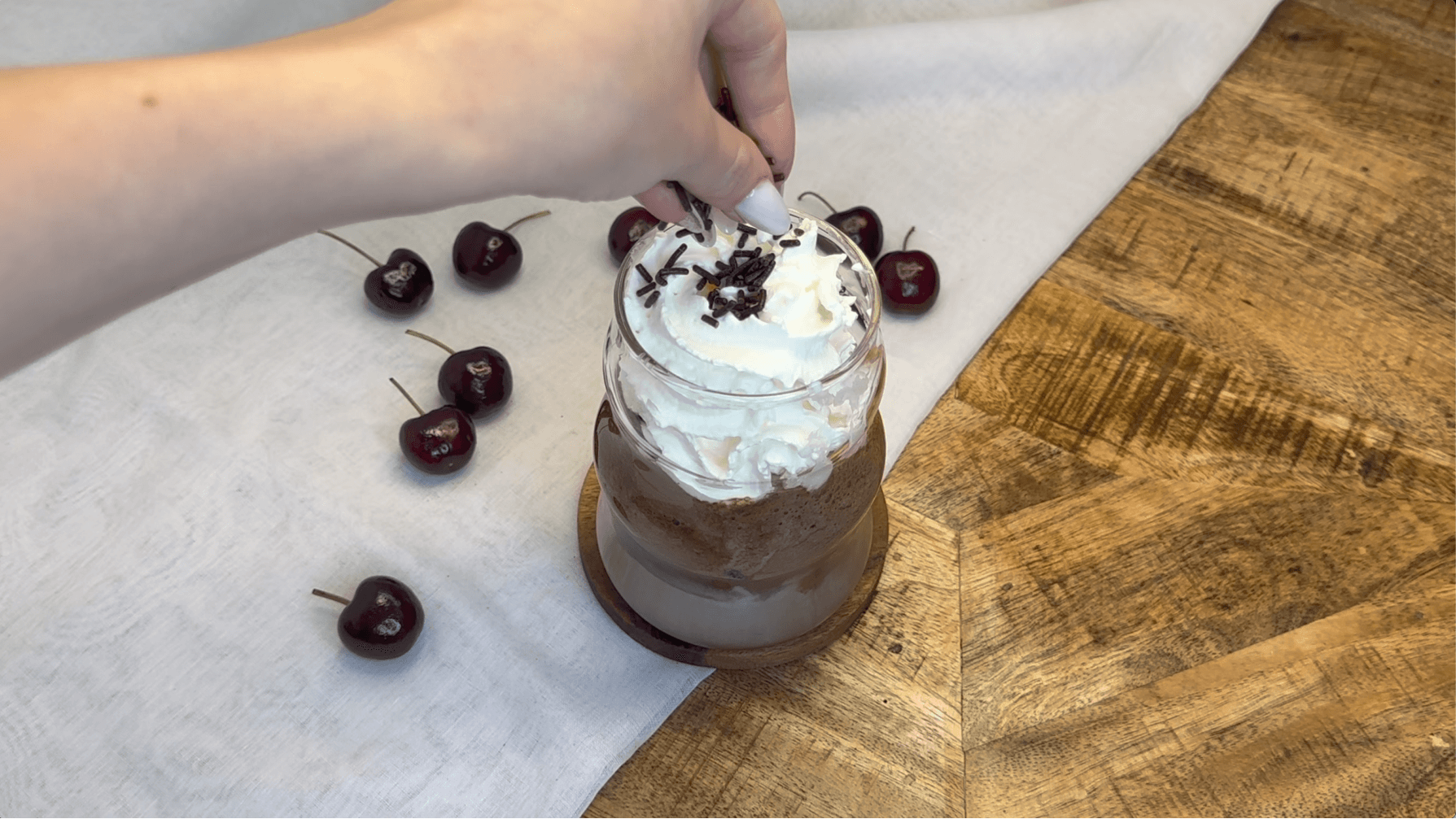 Surmontez la boisson d'un généreux tourbillon de crème fouettée. Saupoudrez de pépites de chocolat et déposez une cerise sur le dessus pour la décoration.