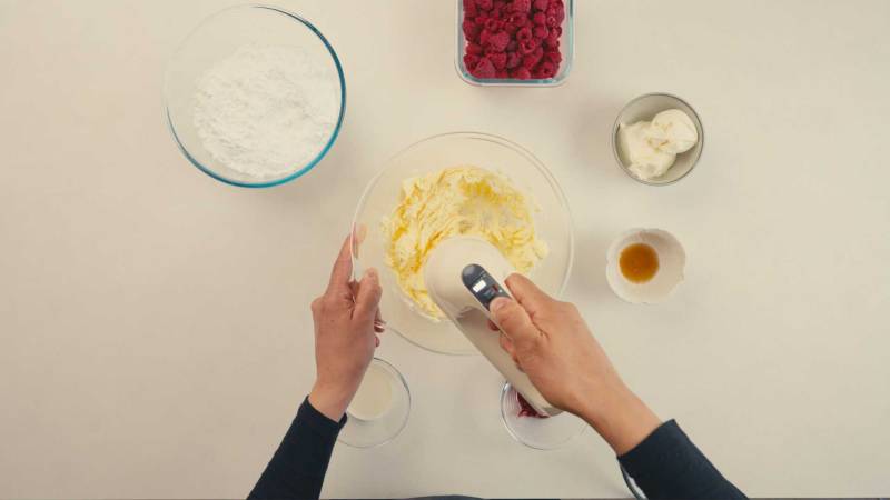 Battez le beurre jusqu'à ce qu'il soit mou. Ajoutez progressivement le sucre glace en mélangeant bien après chaque ajout. Ajoutez du lait au besoin pour obtenir une texture plus lisse. Incorporez la vanille, le sel, la poudre de framboises et la confiture. Enfin, ajoutez le fromage à tartiner et mélangez bien.