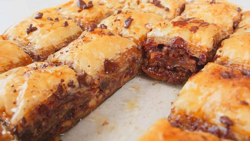 Laat de baklava volledig afkoelen in de bakvorm. Decoreer de afgekoelde baklava met gehakte chocolade.