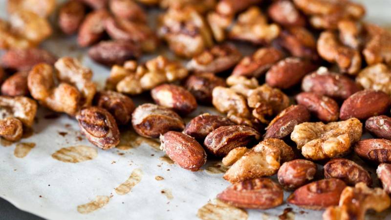Rooster de walnoten en amandelen 10 tot 15 minuten in een voorverwarmde oven op 160°C. Zet aan de kant zodra ze geroosterd zijn.