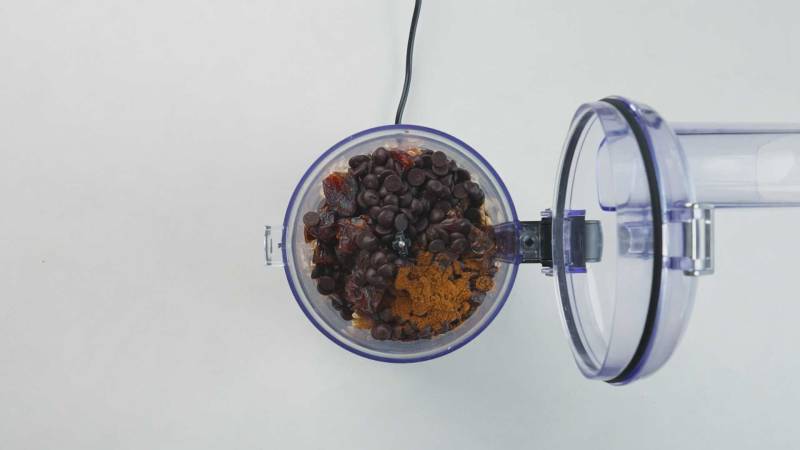 Hak in een keukenmachine de geroosterde walnoten, amandelen, pure chocolate chips, ontpitte dadels, suiker en kaneelpoeder grof. Doe de vulling in een kom en meng het losgeklopte ei erdoor tot alles goed is gemengd.