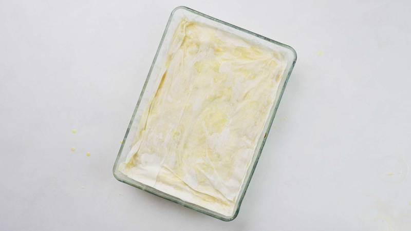 Smelt de ongezouten boter en rol het filodeeg uit. Leg een vel filodeeg op een werkblad en bestrijk het licht met gesmolten boter. Zorg ervoor dat de hoeken bedekt zijn. Vouw het doormidden en leg het in de ingevette bakvorm. Herhaal dit met 9 extra vellen en stapel ze op elkaar.