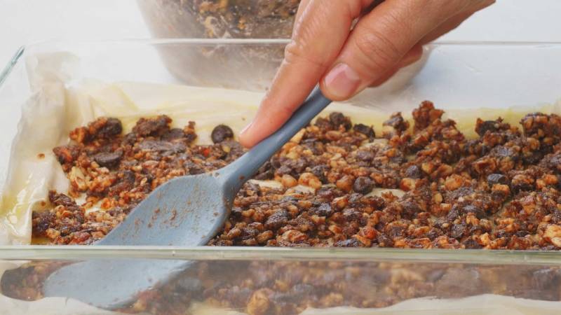 Verdeel de helft van de notenvulling gelijkmatig over de gestapelde filodeegvellen. Herhaal het lagenproces met nog 8 vellen filodeeg en de resterende notenvulling.