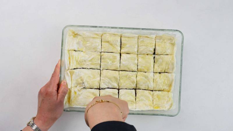 Eindig met een laatste laag van 5 hele vellen filodeeg, waarbij u elk vel met gesmolten boter bestrijkt. Snijd het gelaagde deeg met een scherp mes in gelijke vierkante stukken.