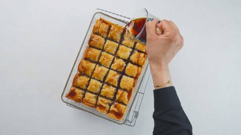 Giet direct na het bakken de voorbereide siroop over de hete baklava, zorg ervoor dat het gelijkmatig verdeeld is.