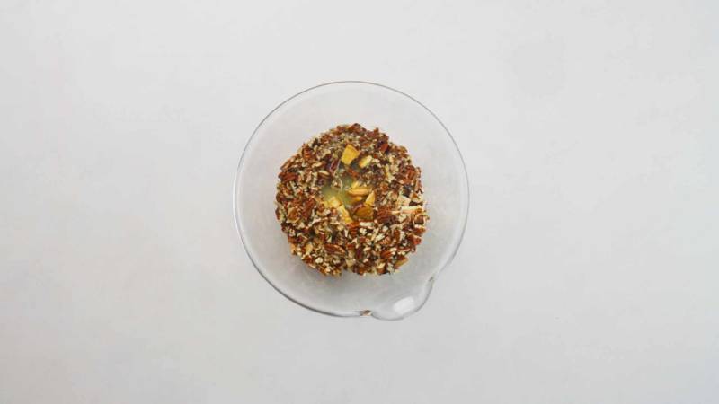 Breek de theebiscuits in stukken en hak de pecannoten. Meng in een mengkom de gehakte pecannoten en biscuitstukjes met het karamelmengsel. Meng tot het goed gemengd is.