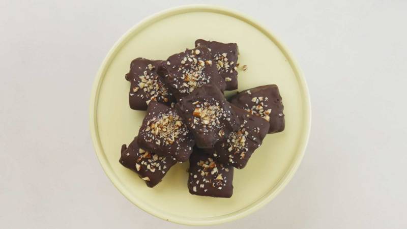 Leg de gedoopte koekjes op een bakplaat bekleed met bakpapier en versier elk koekje met gehakte pecannoten. Zet de koekjes in de koelkast zodat de chocolade kan opstijven.