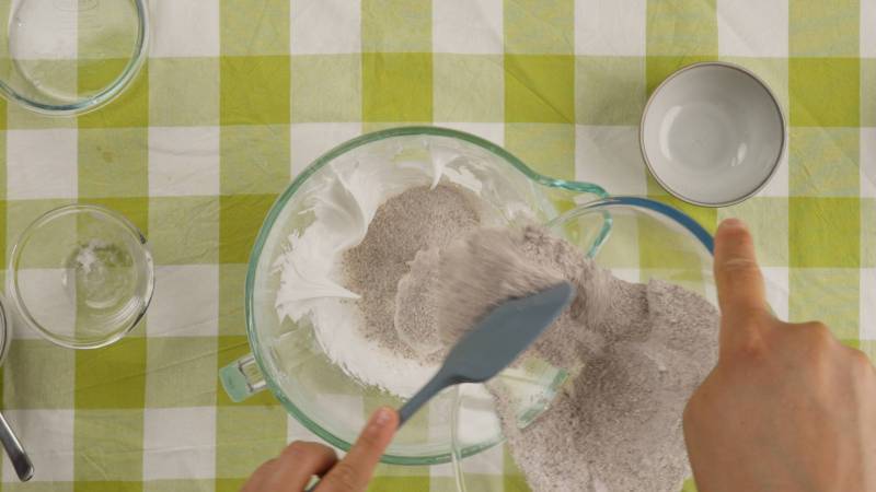 Pour one-third of the almond mixture into the egg whites. Gently fold the dry ingredients into the egg whites, then add the remaining dry ingredients in thirds. Be careful not to mix or stir.