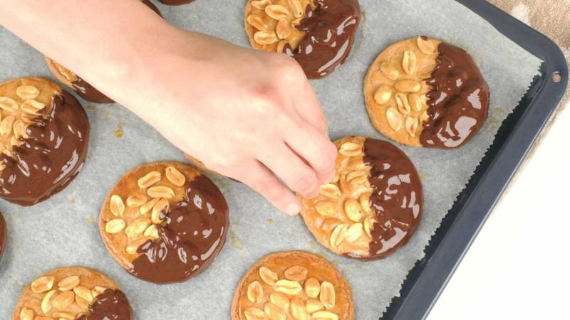 Dip half of each cooled cookie into the tempered chocolate. Place the dipped cookies on baking paper and let the chocolate solidify at room temperature.